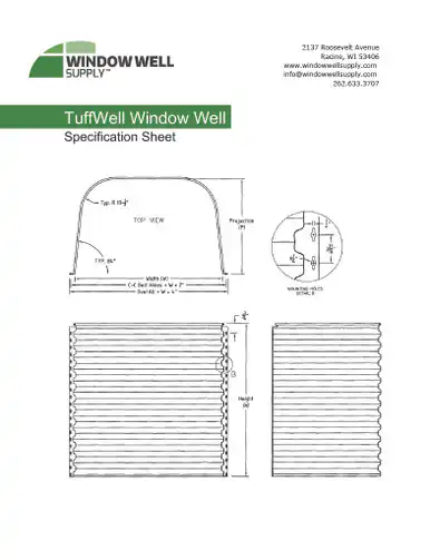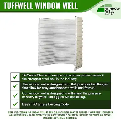 Our Tuffwell window well is made of 19-gauge steel, and its unique corrugation pattern makes it the strongest steel well in the industry. The window well comes with flat, pre-punched flanges that allow for easy attachment to walls and frames. Additionally, our window well is designed to withstand the pressure of heavy clay/soil and aggressive backfilling.