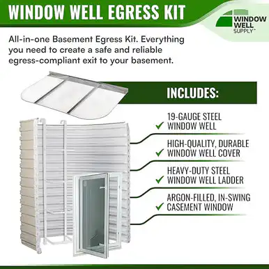 Purchasing a basement egress kit will provide you will all of the items you need to turn your basement into an egress compliant living area. Our kits provide IRC code-compliant items that meet or exceed the minimum requirements for window wells (minimum projection of 36″), window well cover, basement window, and ladder. Protect your family and ensure that your basement is up to code.