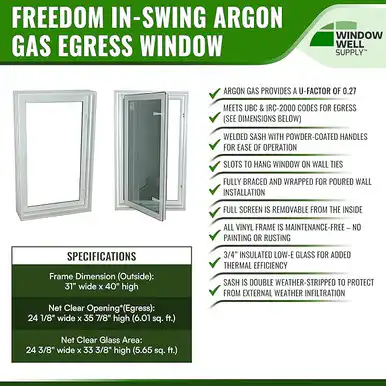 Our in-swing casement basement window meets your needs by offering left- or right-hand installation. The window is 8 inches thick and comes in white. The window is a complete set that includes both the sash and screen.